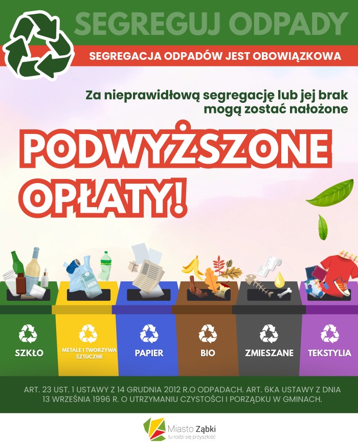 Zgodnie z obowiązującymi przepisami segregacja odpadów komunalnych jest obowiązkowa. Brak segregacji lub prowadzenie jej w sposób nieprawidłowy może skutkować nałożeniem przez Urząd Miasta Ząbki podwyższonej opłaty za nieprawidłowe gospodarowanie odpadami komunalnymi. Wynika to z art. 23 ust. 1 ustawy o odpadach z 14 grudnia 2012 r. oraz art. 6ka ustawy o utrzymaniu czystości i porządku w gminach z 13 września 1996 r.