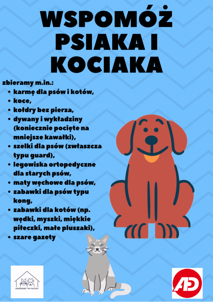 Z inicjatywy Członka Rady Wspólnoty Mieszkaniowej Calineczki 14-16abc, Andersena 28 zachęcamy do wzięcia udziału w akcji zbierania darów dla zwierzaków ze schroniska „Na Paluchu” w Warszawie z okazji zbliżającego się Światowego Dnia Zwierząt obchodzonego dnia 4 października. W tym celu przy pomieszczeniach ochrony zostaną wystawione pojemniki w których mogą Państwo zostawiać potrzebne rzeczy, które pomogą czworonogom ze schronisk przetrwać trudny, zimowy okres. Zbiórka  potrwa do  11  października.