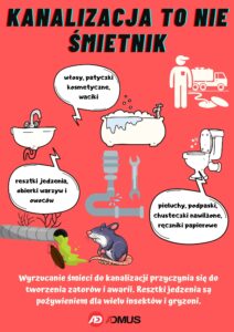 W związku z występującymi na terenie osiedla awariami instalacji kanalizacji, wynikającymi z zatorów w rurach, które są skutkiem wyrzucania do instalacji śmieci, które nie powinny się tam znaleźć, poniżej przedstawiamy plakat informacyjny.