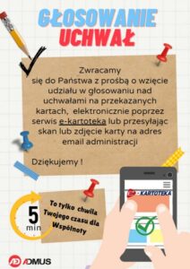Zachęcamy Państwa do czynnego udziału w życiu wspólnoty i oddanie swojego głosu pod uchwałami. Każdy głos jest ważny!