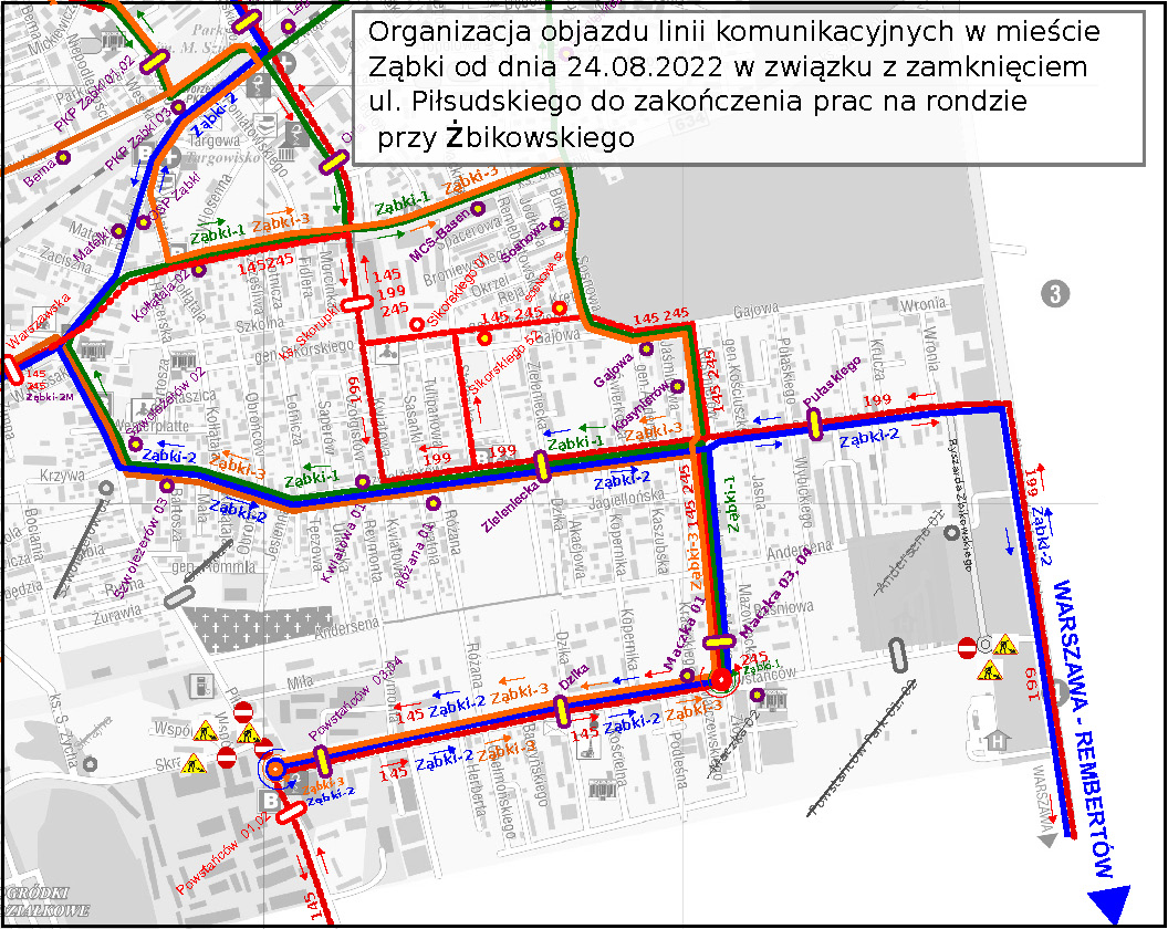 Zmiana nie wiąże się z dodatkowymi zmianami w układzie linii komunikacji zbiorowej – stosowne zmiany w tym zakresie (dla linii Ząbki-1,2 i 199) zostały wprowadzone już 24 sierpnia, utrzymane w rozkładach wprowadzonych 1 września i obowiązują do odwołania (zgodnie z informacjami na rozkładach i tabliczkach przystankowych obowiązujących od 1 września). O przywróceniu przystanków Andersena 01, Powstańców Park 01 i 02 i Maczka 02 i zawieszeniu przystanków na objeździe Pułaskiego 01 i 02 poinformujemy z min. 1 dniowym wyprzedzeniem na przystankach i w autobusach oraz w systemie kiedyprzyjedzie.pl „