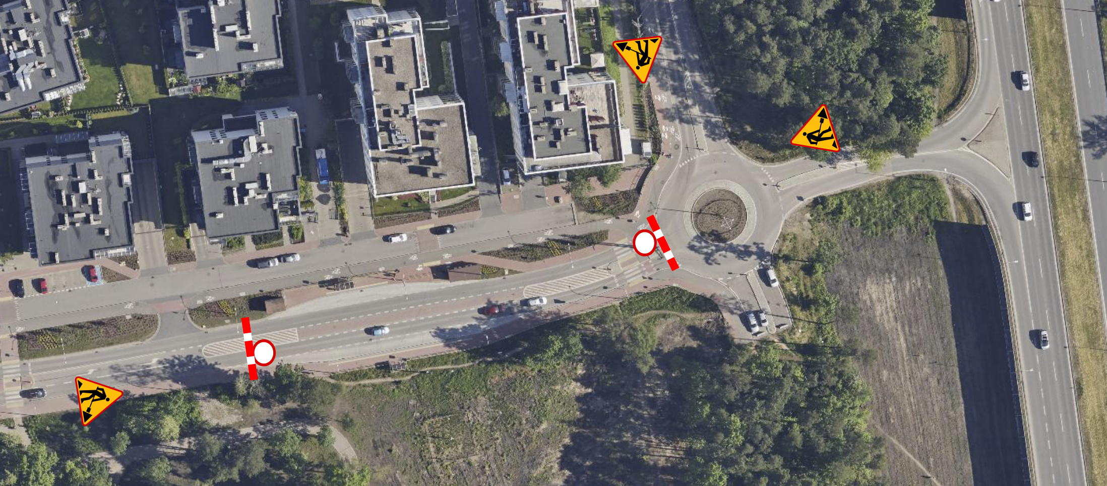 Prosimy o zachowanie ostrożności i ograniczenie prędkości przy przejeździe przez rondo, na którym mogą nadal trwać prace lub zawężenia pasa ruchu przy wyspie centralnej lub wylocie w kierunku drogi wojewódzkiej.